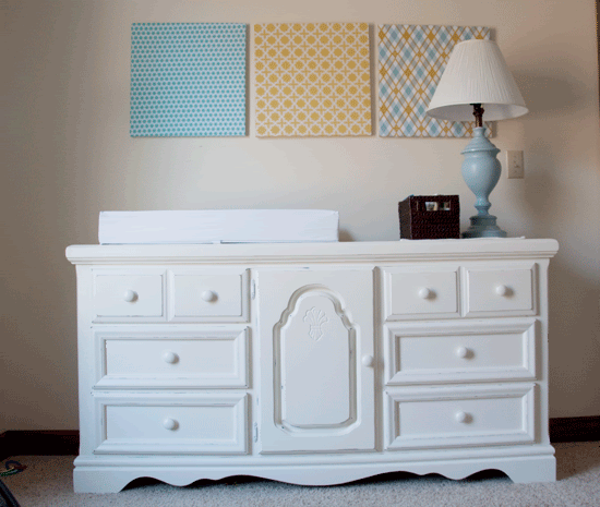 I needed a changing table/dresser for Emmett's room. I really liked this dresser from Pottery Barn, but because I'm on a budget and because I wanted something longer I was determined to find just that. Something longer and a whole lot cheaper. The only downfall to that was that I had to visit the Salvation Army probably 10-15 times to find it and Greg spent some serious hours on this baby. Well worth it in my opinion. I ended up getting this solid wood dresser for $40 and probably put another $40 into hardware, paint, primer and sandpaper and then just tried to copy Pottery Barns idea. I'm so happy with the way it turned out.